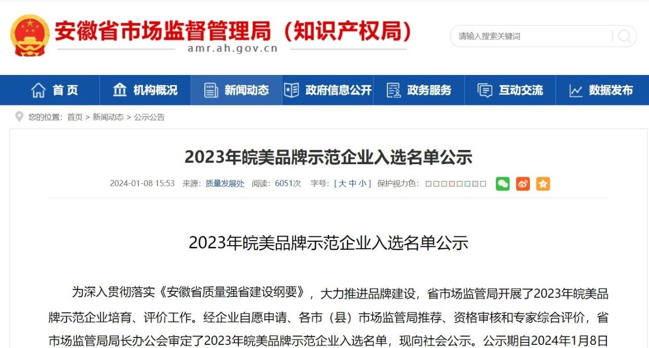 1月8日,安徽省市場(chǎng)監(jiān)督管理局公布“2023年皖美品牌示范企業(yè)”名單,集團(tuán)兩家子公司聯(lián)袂入選、位列其中。
