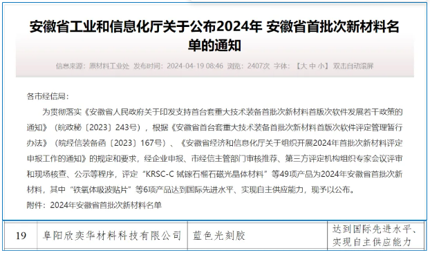 近日,經(jīng)企業(yè)申報(bào)、市經(jīng)信主管部門審核推薦、第三方評(píng)定機(jī)構(gòu)組織專家會(huì)議評(píng)審和現(xiàn)場(chǎng)核查、公示等程序,安徽省工業(yè)和信息化廳評(píng)定49項(xiàng)產(chǎn)品為2024年安徽省首批次新材料并發(fā)布名單,其中欣奕華材料“藍(lán)色光刻膠”產(chǎn)品經(jīng)評(píng)定達(dá)到“國(guó)際先進(jìn)水平、實(shí)現(xiàn)自主供應(yīng)能力”。