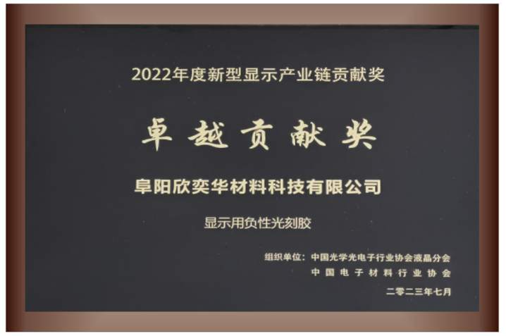 會上,阜陽欣奕華材料科技有限公司(以下簡稱“欣奕華材料”)顯示用負性光刻膠榮獲“中國新型顯示產(chǎn)業(yè)鏈-卓越貢獻獎”。