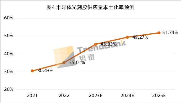 勢銀(TrendBank)統(tǒng)計(jì)數(shù)據(jù)顯示,低端半導(dǎo)體光刻膠(紫外負(fù)膠、g線、i線)本土化率接近45%,而高端(KrF、ArF)光刻膠本土化供應(yīng)率由2021年的1.5%提升至2022年的4.0%。勢銀(TrendBank)預(yù)計(jì)到2025年本土化率能夠超過50%,本土化率主要來自低端線和KrF線的提升,ArF光刻膠大陸企業(yè)紛紛開始驗(yàn)證,尚未有企業(yè)通過驗(yàn)證進(jìn)入供應(yīng)階段,作為中國大陸目前能夠使用光刻膠的最高端線,KrF與ArF光刻膠布局大有機(jī)會。